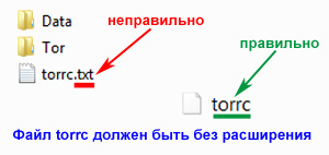 Файл torrc должен быть без расширения (на скрине он ошибочно назван torrc.txt)