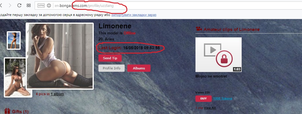 Возьмём, к примеру, модель SashaRoksi. Рядом с последними аватарками стоит обозначение a.k.a и дальше идут все использованные моделью никнеймы на бонге/рунетках. Справа диаграммы активности на сайте.