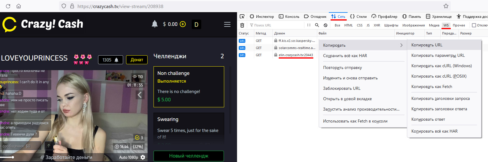 На странице трансляции нажать F12. Вкладка Сеть - вкладка WS - нажать F5 (обновить страницу)