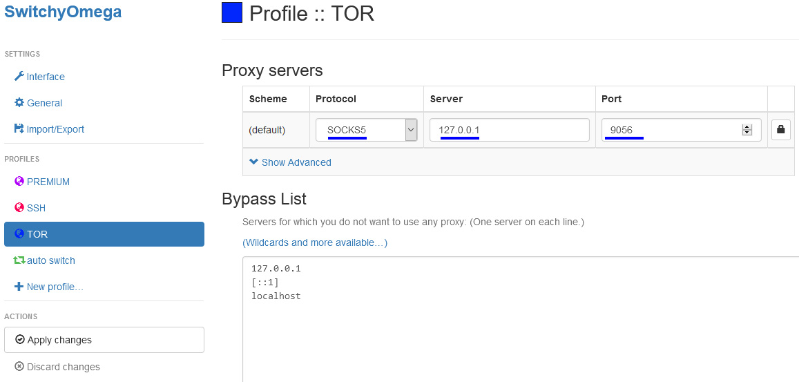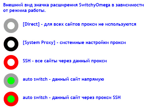 Подробно настройка браузерного расширения SwitchyOmega описана под спойлером "Настройка расширения SwitchyOmega" здесь: