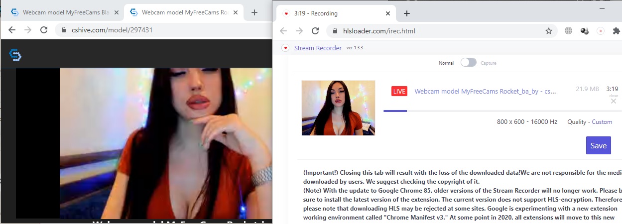 P.S. У записи через cshive есть ещё один минус. Начало стрима модели в вебкаме и на cshive, далеко не всегда совпадают. Зачастую, модель стримит на вебкам сайте уже минут 10 - 15, а на cshive всё ещё ноль.