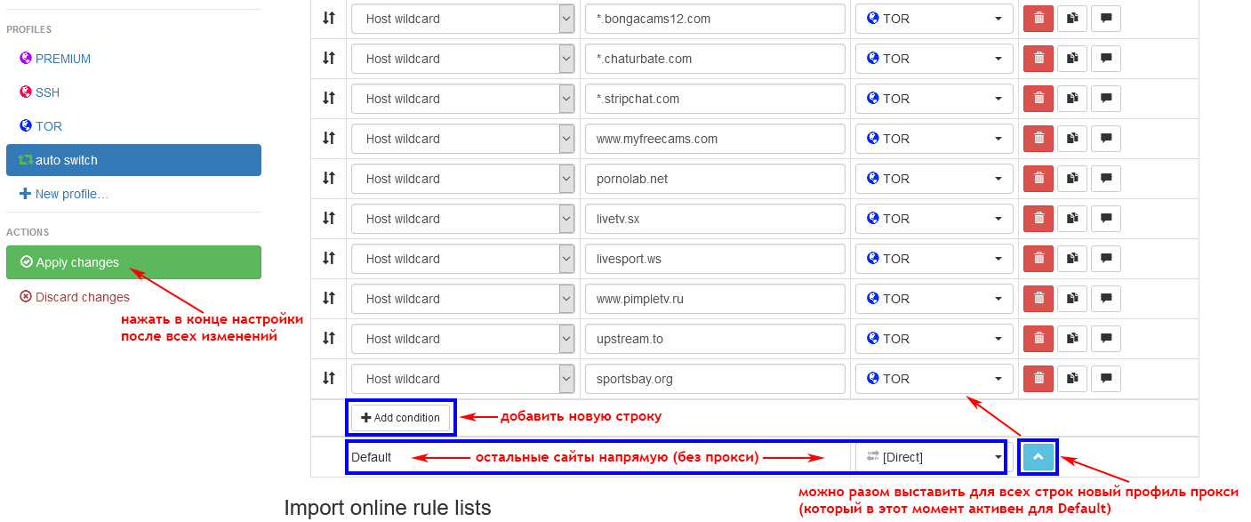 Через кнопку "Publish rule list" (справа в верхней части окна) можно скопировать в текстовый файл (.sorl) список сайтов. При настройке следующего Switch Profile можно импортировать список сайтов из этого файла (.sorl). В нижней части окна надпись: "Import online rule lists" и соответствующая кнопка "Add a rule list".